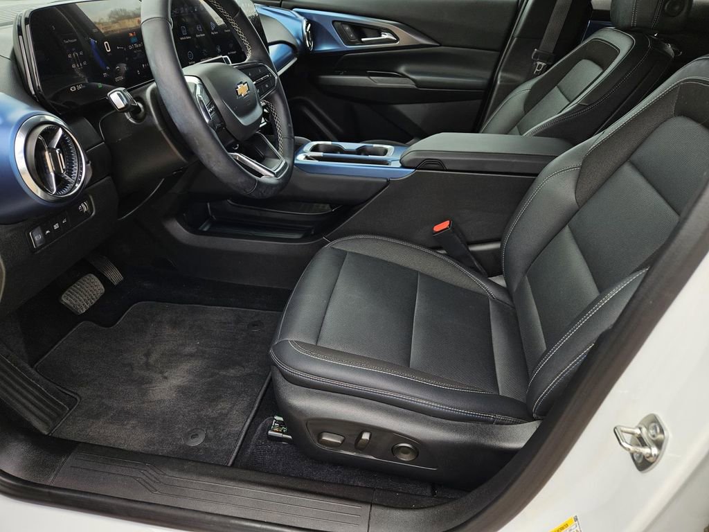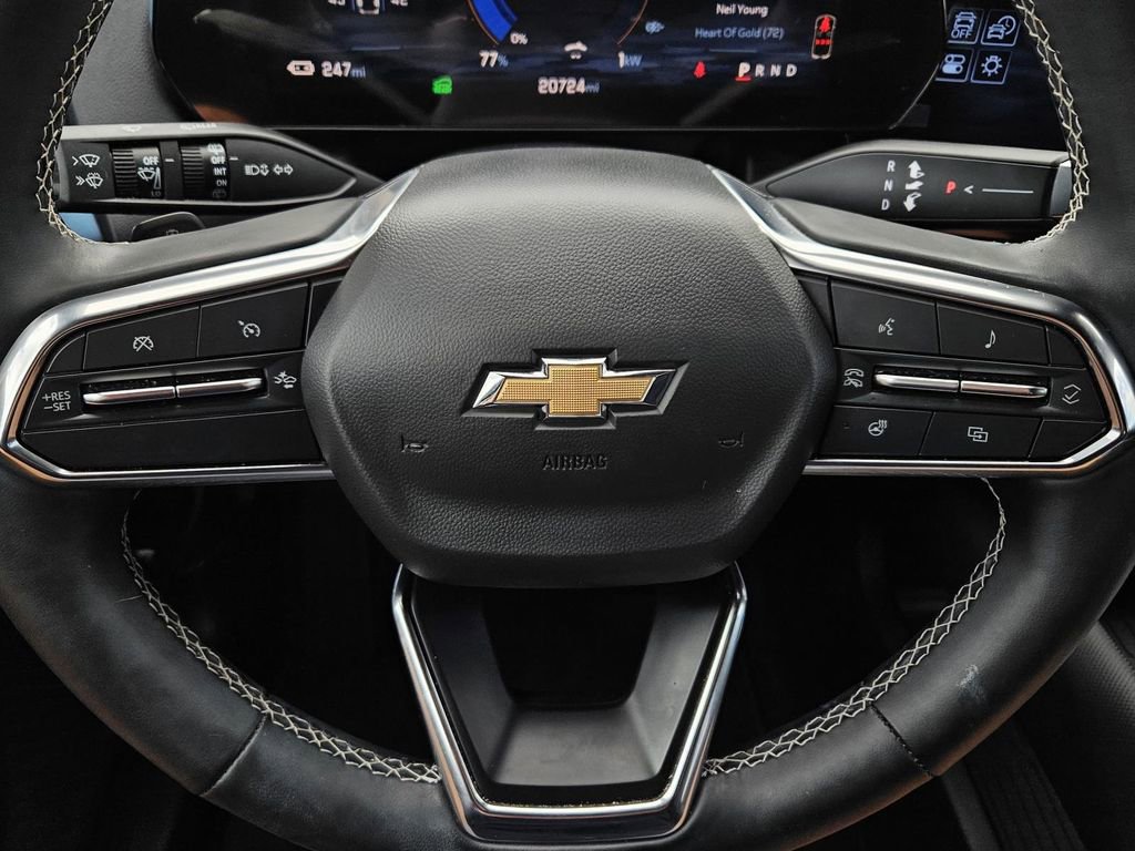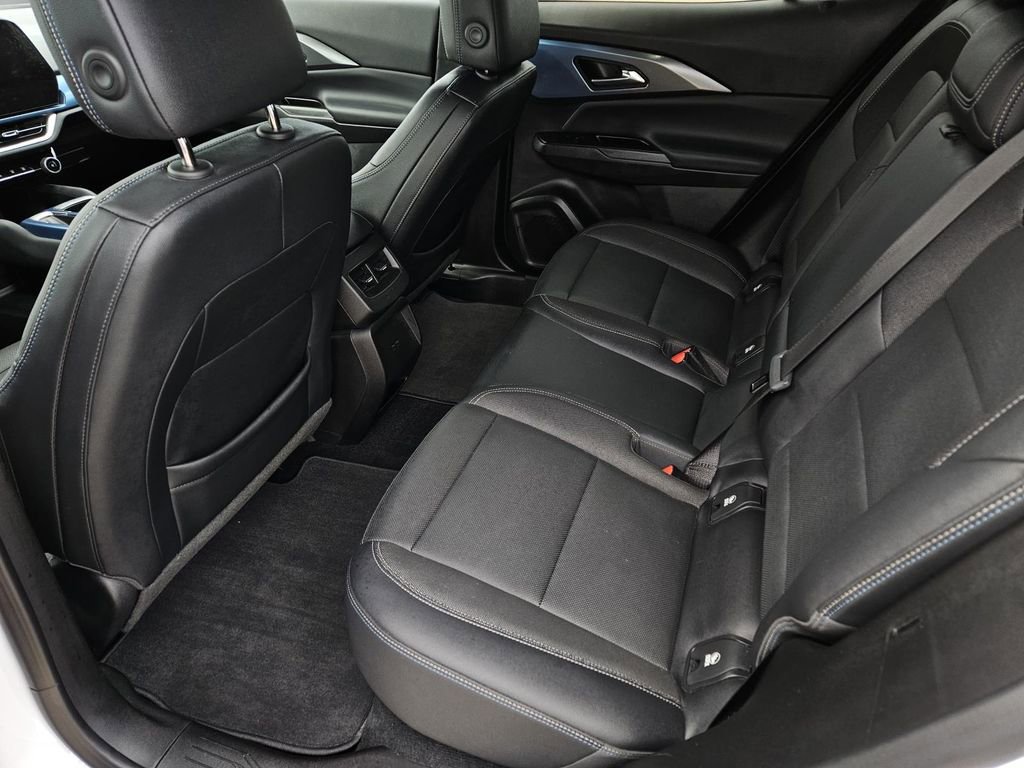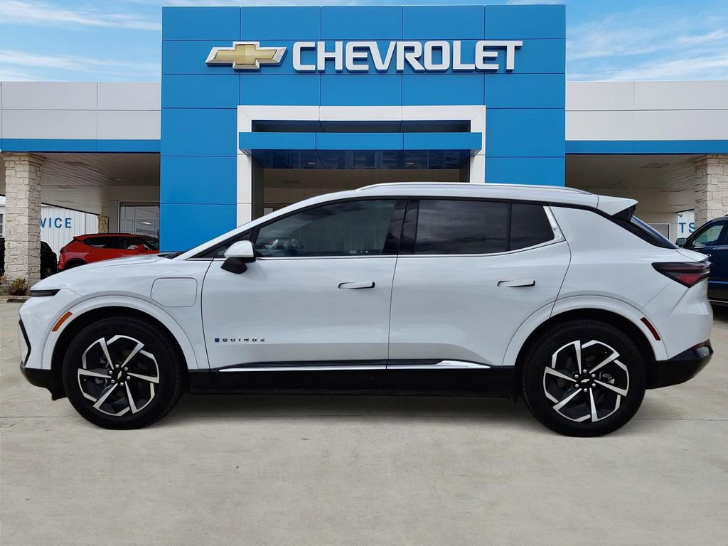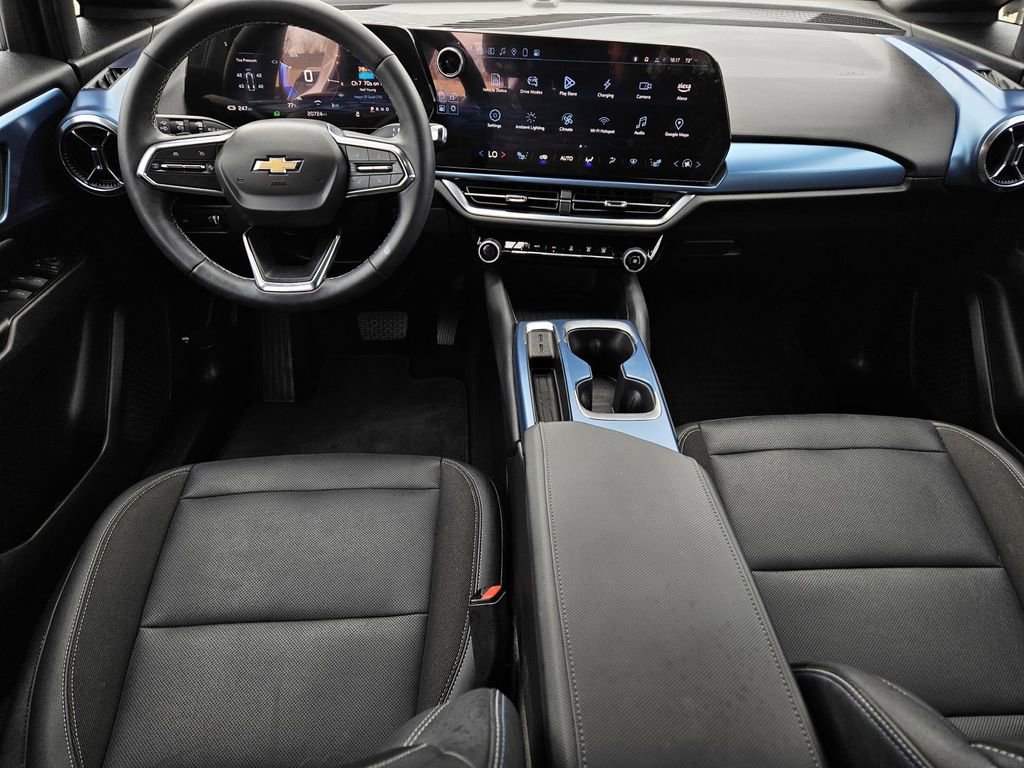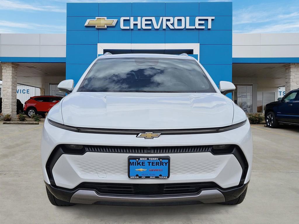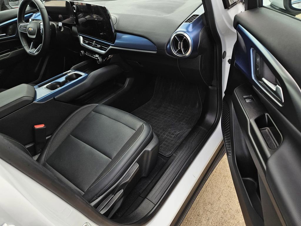 Preferred Equipment Group 2LT, Equinox EV LT, 4D Sport Utility, Electric Drive Unit, FWD, Summit White, Black With Blue Accents Leatherette, 19 Wheels, 4-Wheel Disc Brakes, 6 Speakers, 6-Speaker Audio System Feature, 6-Way Manual Front Passenger Seat Adjuster, 8-Way Power Driver Seat Adjuster, ABS brakes, Air Conditioning, Alloy wheels, AM/FM radio: SiriusXM with 360L, Auto High-beam Headlights, Auto-dimming Rear-View mirror, Automatic temperature control, Brake assist, Bumpers: body-color, Compass, Delay-off headlights, Driver 4-Way Power Lumbar Control, Driver door bin, Driver vanity mirror, Dual front impact airbags, Dual front side impact airbags, Electronic Stability Control, Emergency communication system: OnStar and Chevrolet connected services capable, Evotex Seat Trim, Four wheel independent suspension, Front anti-roll bar, Front Bucket Seats, Front Center Armrest, Front reading lights, Fully automatic headlights, Heated door mirrors, Heated Driver & Fr Passenger Seats Cushion & Seatback, Heated front seats, Heated steering wheel, Illuminated entry, Knee airbag, Low tire pressure warning, Navigation system: Google built-in compatibility (select service plan required, terms and limitations apply), Occupant sensing airbag, Outside temperature display, Overhead airbag, Overhead console, Panic alarm, Passenger door bin, Passenger vanity mirror, Power door mirrors, Power driver seat, Power Liftgate, Power steering, Power windows, Radio: 17.7 Diagonal Advanced Color LCD Display, Rear anti-roll bar, Rear reading lights, Rear seat center armrest, Rear window defroster, Rear window wiper, Remote keyless entry, Security system, SiriusXM w/360L, Speed control, Split folding rear seat, Spoiler, Steering wheel mounted audio controls, TBD Axle Ratio, Telescoping steering wheel, Tilt steering wheel, Traction control, Trip computer, Turn signal indicator mirrors, and Variably intermittent wipers.