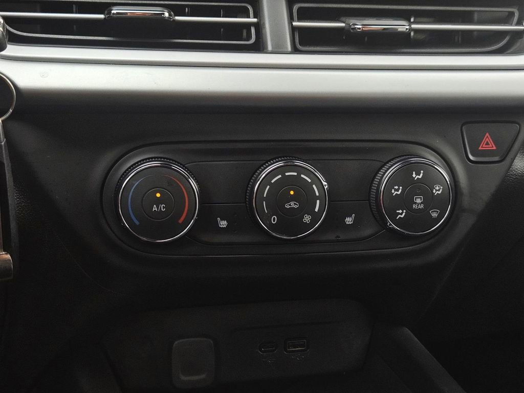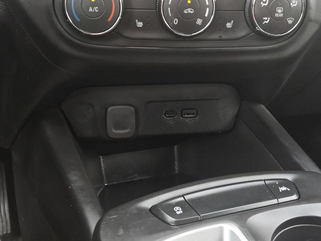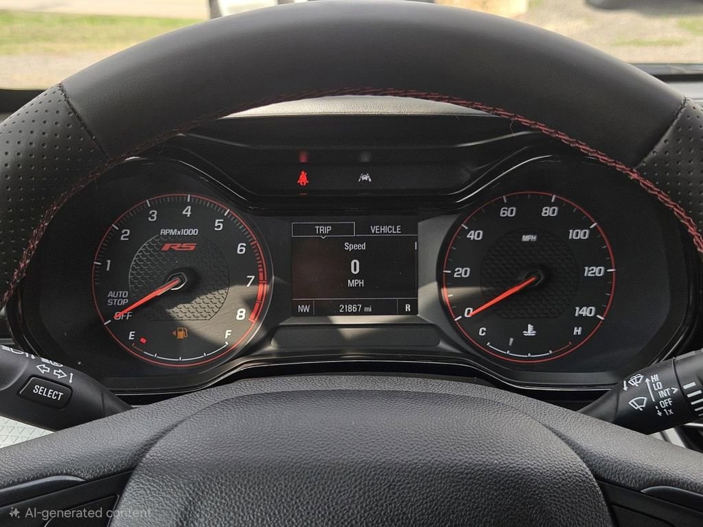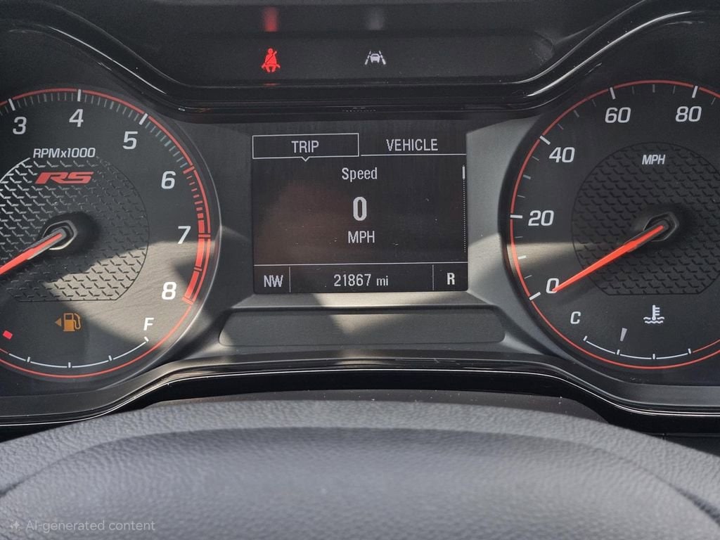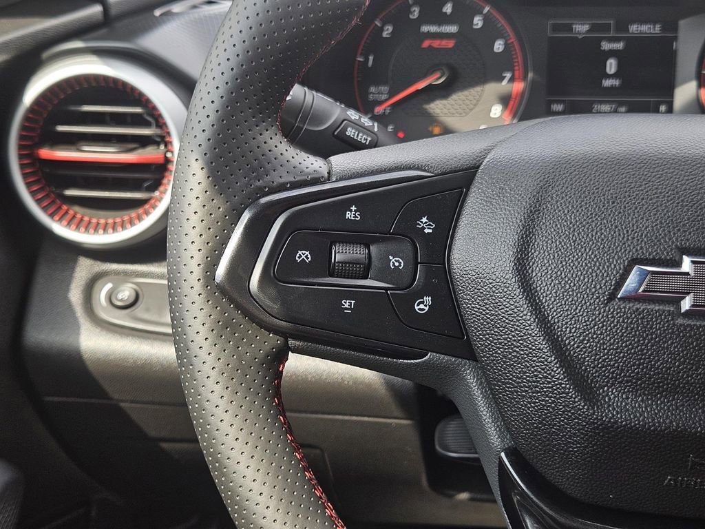 License Plate Front Mounting Package, Preferred Equipment Group 1RS, 2-Way Adjustable Front Head Restraints, 3.50 Final Drive Axle Ratio, 4 Speakers, 4-Speaker Audio System Feature, 4-Way Manual Front Passenger Seat Adjuster, 4-Wheel Disc Brakes, 6-Way Manual Driver Seat Adjuster, ABS brakes, Air Conditioning, Alloy wheels, AM/FM radio: SiriusXM, Auto High-beam Headlights, Brake assist, Bumpers: body-color, Cloth Seat Trim, Compass, Delay-off headlights, Driver door bin, Driver vanity mirror, Dual front impact airbags, Dual front side impact airbags, Electronic Stability Control, Emergency communication system: OnStar One Essentials, Exterior Parking Camera Rear, Front and Rear All-Weather Floor Liners, Front anti-roll bar, Front Bucket Seats, Front Center Armrest, Front reading lights, Front wheel independent suspension, Fully automatic headlights, Heated door mirrors, Heated Driver and Front Passenger Seats, Heated front seats, Heated steering wheel, Illuminated entry, Leather steering wheel, Low tire pressure warning, Occupant sensing airbag, Outside temperature display, Overhead airbag, Overhead console, Panic alarm, Passenger door bin, Passenger vanity mirror, Power door mirrors, Power steering, Power windows, Premium audio system: Chevrolet Infotainment 3, Radio data system, Radio: Chevrolet Infotainment 3 System with AM/FM, Rear window defroster, Rear window wiper, Remote keyless entry, Security system, SiriusXM Trial Subscription, Speed control, Split folding rear seat, Spoiler, Sport steering wheel, Steering wheel mounted audio controls, Tachometer, Telescoping steering wheel, Tilt steering wheel, Traction control, Trip computer, Variably intermittent wipers, and Wheels: 18 Black-Painted Machined Aluminum.