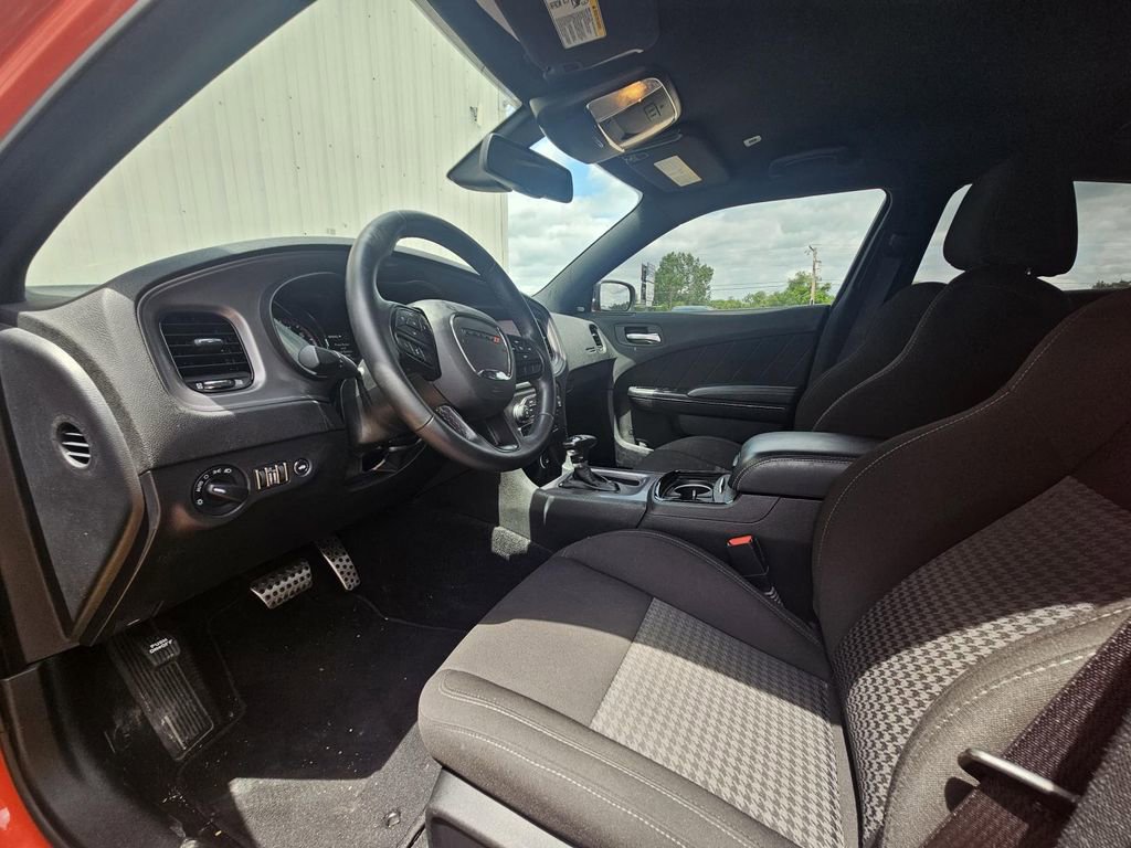 Blacktop Package (Black 1-Piece Performance Spoiler, Black Badge, Black Dodge Grille Badge, Gloss Black I/P Cluster Trim Rings, Rhombi 2-Pc Wheel Center Cap, Satin Black Charger Decklid Badge, Satin Black Dodge Tail Lamp Badge, and Wheels: 20 x 8 Black Noise Painted), Quick Order Package 2EH, Black Cloth, 1-Yr SiriusXM Guardian Trial, 2-Piece Shark Fin Antenna, 4-Wheel Disc Brakes, 4G LTE Wi-Fi Hot Spot, 6 Speakers, 8.4 Touchscreen Display, ABS brakes, Air Conditioning, Alloy wheels, AM/FM radio: SiriusXM, Anti-whiplash front head restraints, Apple CarPlay, Apple CarPlay/Android Auto, Auto-dimming Rear-View mirror, Automatic temperature control, Brake assist, Bumpers: body-color, Cloth Performance Seats, Compass, Delay-off headlights, Driver door bin, Driver vanity mirror, Dual front impact airbags, Dual front side impact airbags, Electronic Stability Control, Emergency communication system: SiriusXM Guardian, For Details, Visit DriveUconnect.com, Four wheel independent suspension, Front anti-roll bar, Front Bucket Seats, Front Center Armrest, Front dual zone A/C, Front License Plate Bracket, Front reading lights, Fully automatic headlights, Garage door transmitter: HomeLink, Google Android Auto, GPS Antenna Input, HD Radio, Heated door mirrors, Illuminated entry, Integrated Center Stack Radio, Integrated Voice Command w/Bluetooth, Knee airbag, Leather Shift Knob, Low tire pressure warning, Media Hub (2 USB, AUX), Occupant sensing airbag, Outside temperature display, Overhead airbag, Overhead console, Panic alarm, ParkView Rear Back-Up Camera, Passenger door bin, Passenger vanity mirror, Power 2-Way Driver Lumbar Adjust, Power 8-Way Driver Seat, Power door mirrors, Power driver seat, Power steering, Power windows, Radio: Uconnect 4C w/8.4 Display, Rear anti-roll bar, Rear Armrest w/Cupholder Seat, Rear reading lights, Rear seat center armrest, Rear window defroster, Remote keyless entry, Speed control, Speed-Sensitive Wipers, Split folding rear seat, Spoiler, Steering wheel mounted audio controls, Tachometer, Telescoping steering wheel, Tilt steering wheel, Traction control, Trip computer, USB Host Flip, Variably intermittent wipers, and Wheels: 20 x 8 Satin Carbon PainteD.
